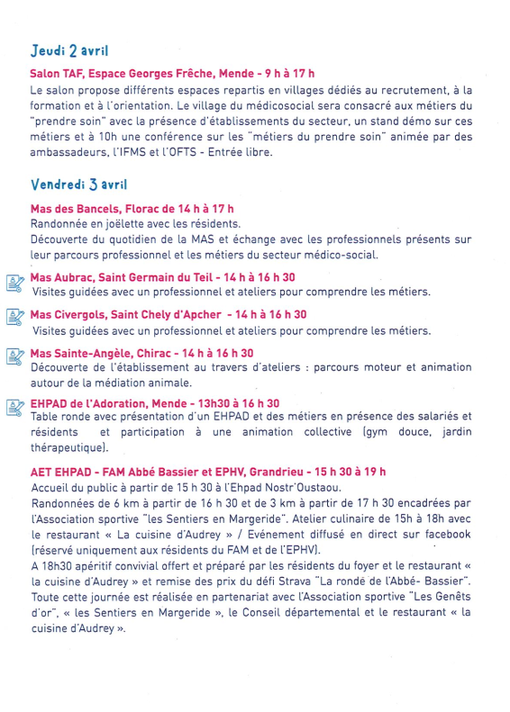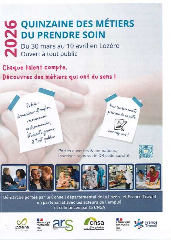 Cet évènement a pour objectif de promouvoir les métiers du soin et de l'accompagnement, porté par le conseil départemental de la Lozère, l'ARS et France Travail et en partenariat avec d'autres acteurs du territoire, cofinancé par la CNSA (Caisse Nationale de Solidarité pour l'Autonomie).